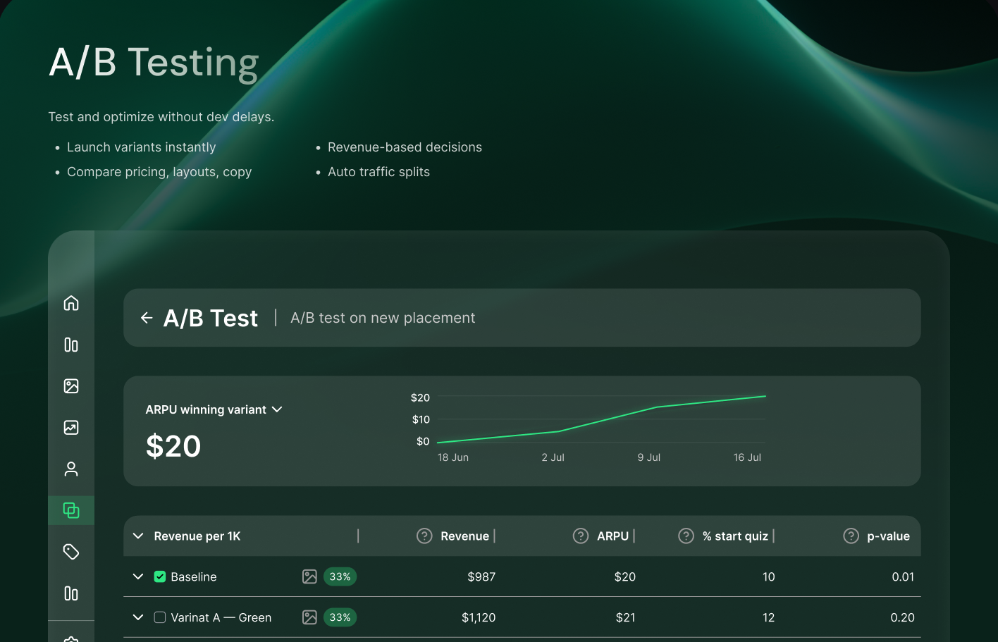 Launch experiments instantly and make data-driven decisions based on actual revenue. Compare different versions of your quizzes and paywalls to find what converts best, without waiting for app releases or developer resources.