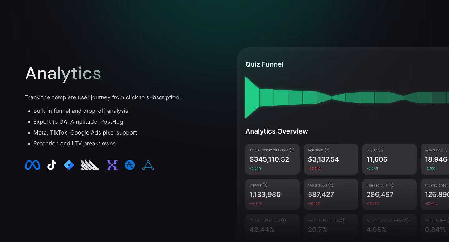 - Conversion metrics from quiz start to paywall