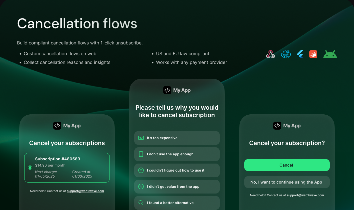 Why cancellation flows matter: Easy cancellation isn't just about compliance. It builds trust, reduces chargebacks, and gives you valuable data about why users leave. A well-designed cancellation flow can recover 10-30% of users who intended to cancel.