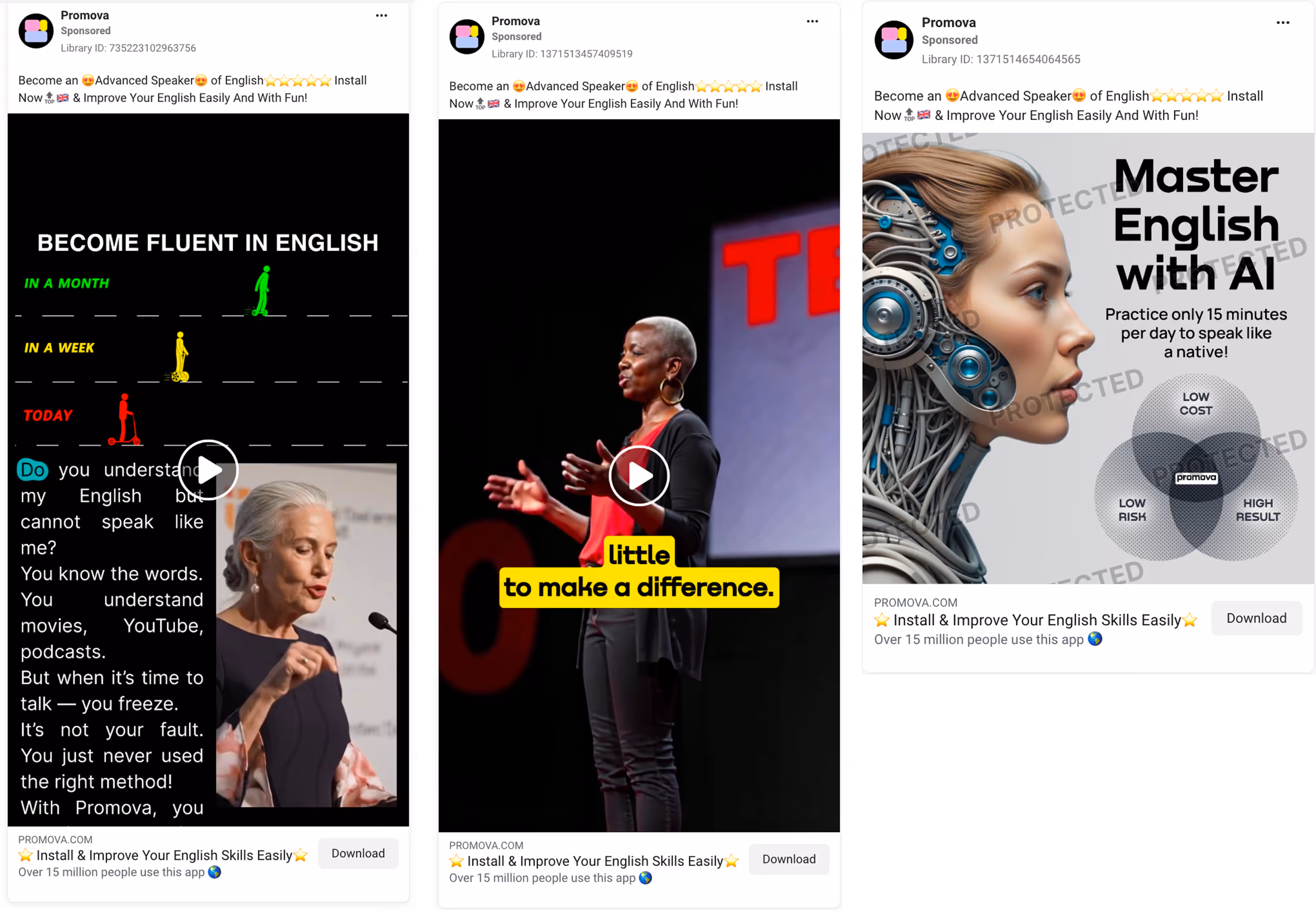 The caption users see in 59,824 ads is promova.com while the actual landing URL is english-improve.com. The brand domain and the performance domain are completely separate: users recognize the brand name, but the page they land on has no connection to it.