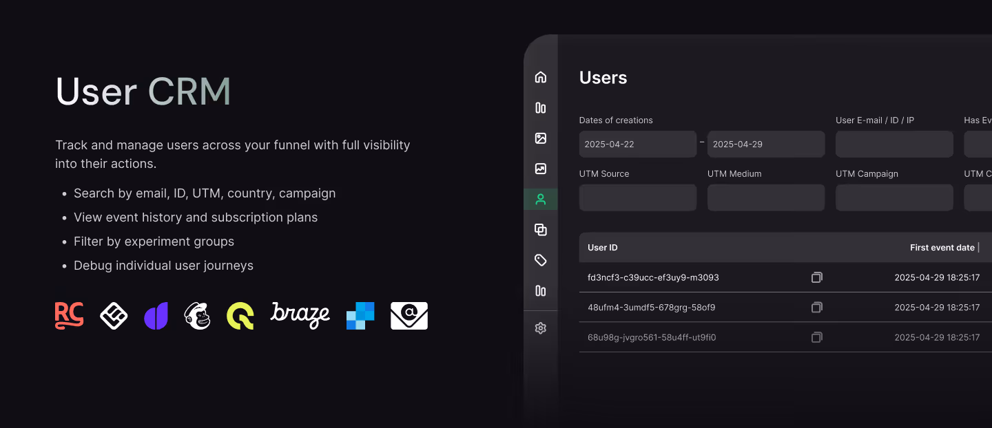 Why User CRM matters: Understanding individual users helps you provide better support, identify high-value customers, debug conversion issues, and make smarter decisions about product and pricing.